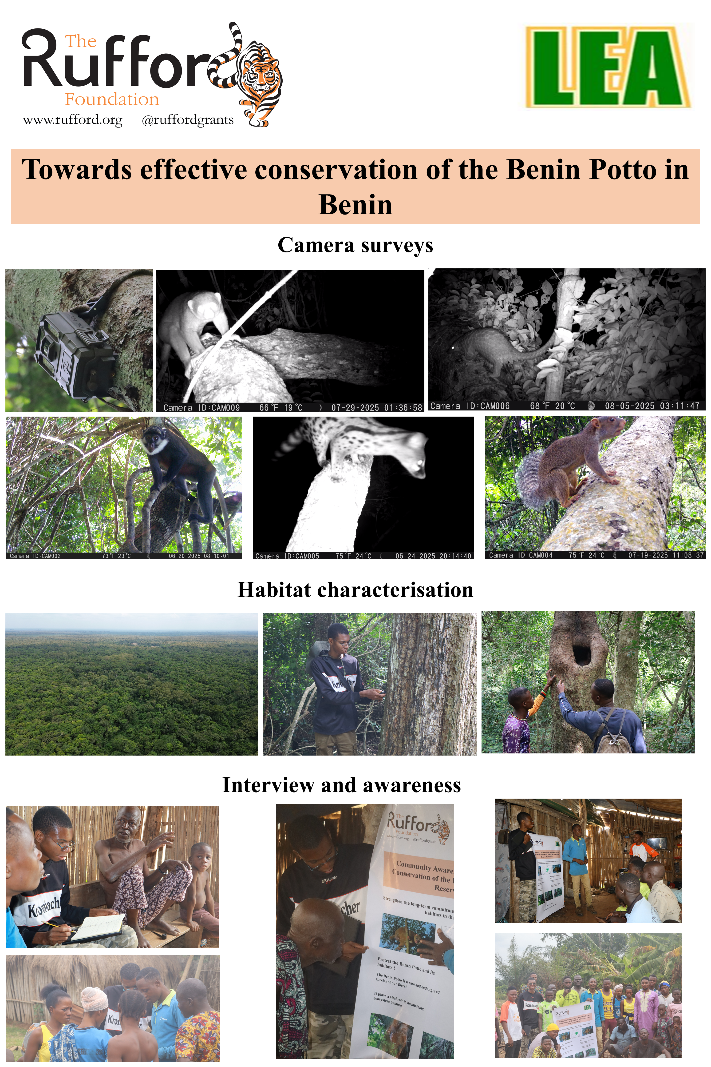 In Benin, particularly within the sizable but understudied Lama Forest Reserve, there has been no focused scientific investigation into the Benin Potto. The project seeks to address this lack of data by conducting the first comprehensive study of the species in its natural habitat. The primary aims of the project are threefold: (i) to estimate the population size and distribution of the Benin Potto within the Lama Forest Reserve, (ii) to evaluate the micro-habitat factors that influence the species' occurrence site selection, and (iii) to explore the ethnozoological aspects by understanding local communities' perceptions and attitudes towards the Benin Potto.