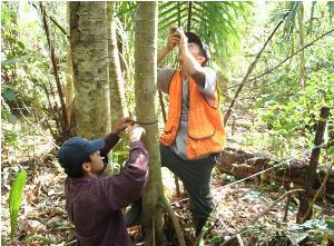 One community member measuring the diameter of a Cecropia sp. tree while another measures the height. Note the plot marker post and transect tape to mark the edge of the quadrat.