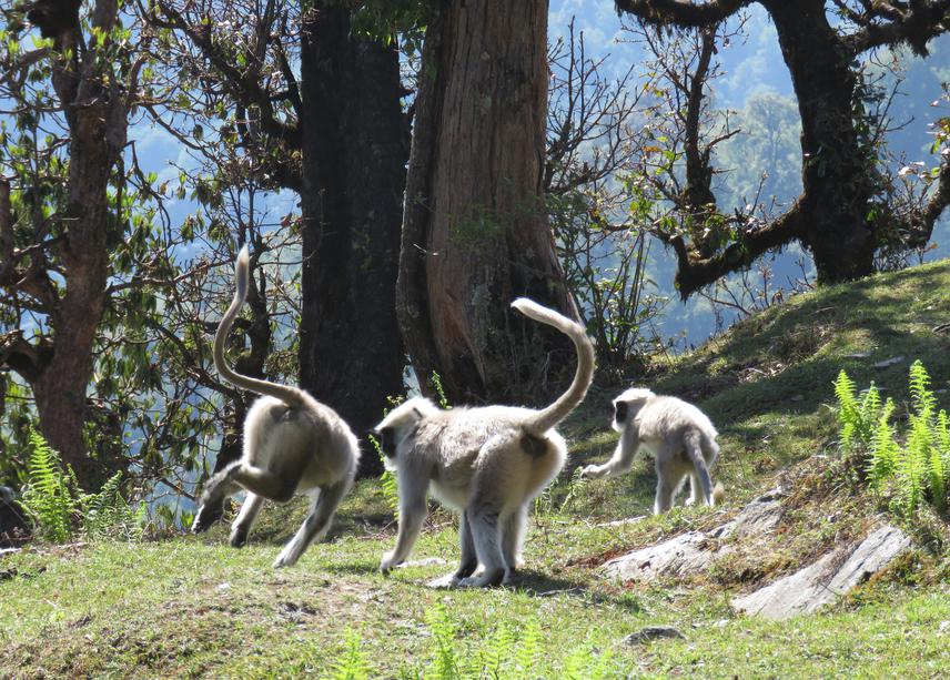Himalayan langurs (Semnopithecus schistaceus) running away from farmland. © Subhajit Saha