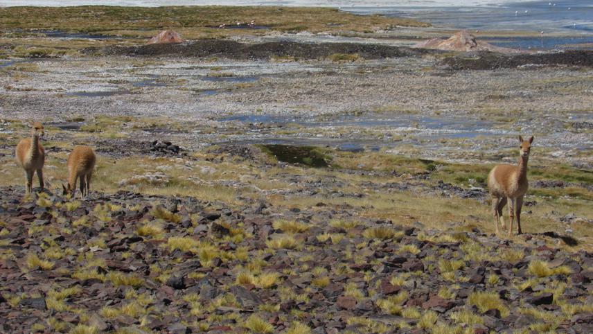 Vicugna vicugna, one of the protected species present in the reserve, feeding at the edge of the lagoon. ©Thamara Fariñas Torres.