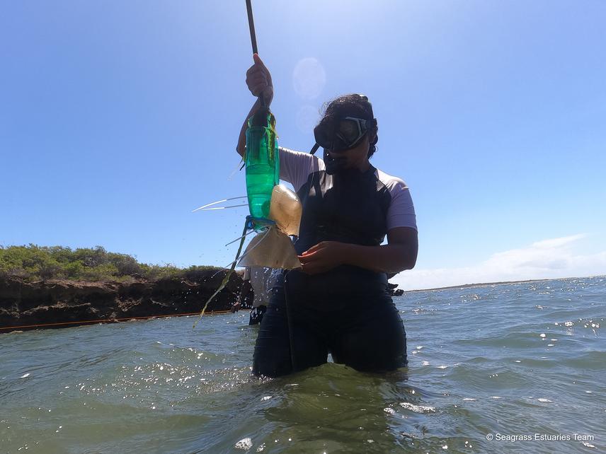 Retrieval of a sediment trap from the estuary floor in Irodo, Antsiranana II, Madagascar, to monitor and analyze sedimentation in seagrass meadows. ©Seagrass Estuaries Team.